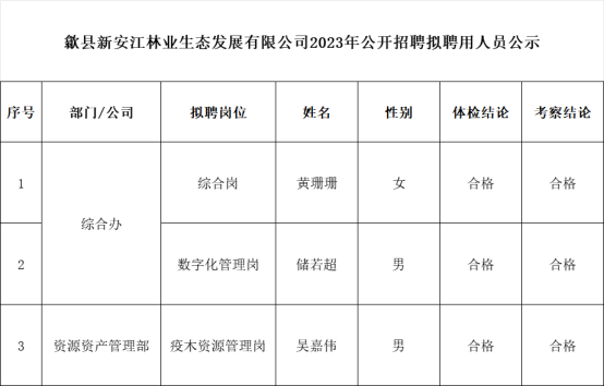 按照《歙县新安江林业生态发展有限公司2023年公开招聘工作人员公告》规定,经过笔试、面试、体检、考察等程序,现将拟聘用人员名单予以公示。公示期限为5个工作日,时间为2024年1月4日至1月10日。